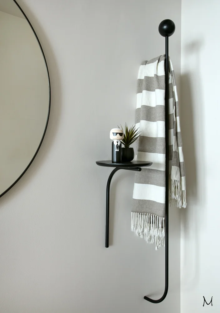 A stylish coat rack and mounted wall table create a simple yet captivating silhouette in the hallway that artfully balances functionality and aesthetics. The geometric look adds to the sculptural essence of the rack and towel, creating a powerful statement in the hallway. Adding some personality to the open space is a hand painted wooden Karl doll by Scandinavian designed Lucie Kaas.